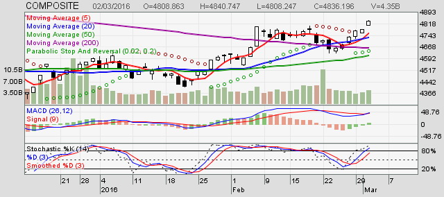 Pada perdagangan 2 Maret 2016 IHSG ditutup menguat 56,211 poin ke posisi 4836,196.